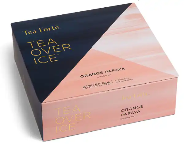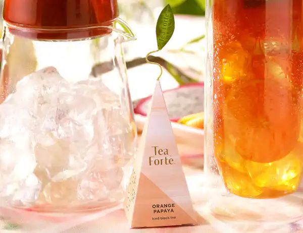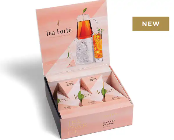 PACHET DE CADOU Setul nostru de Carafe Tea Over Ice® pentru pregatirea ceaiului rece este disponibil ca un pachet 5 de piramide de ceai negru Orange Papaya! Infuzați ceai rece autentic Tea Forte cu ajutorul setului de carafe Tea Over Ice®. Cele două carafe realizate manual, rezistente la căldură Steep & Chill™ ( Infuzeaza si raceste) infuzează ceai rece în câteva minute și se pot aseza una peste alta pentru o prezentare deosebita pe masă. Făcute din sticlă durabilă, rezistentă la căldură, aceste carafe sunt capabile să reziste unei game largi de extreme de temperatură. Piramidele cu ceai rece sunt aproximativ cu 33% mai mari decât piramidele pentru ceaiul cald și sunt amestecate special pentru a fi realiza un ceai proaspat și plin de aromă prin procesul de răcire rapidă. Fiecare piramida de ceai rece produce 720 ml de ceai rece răcoritor. Pentru a infuza, adăugați o piramida de ceai rece în carafa de sus, umpleți cu apă fierbinte și infuzați timp de 5 minute. După infuzare, răciți rapid turnând ceaiul fierbinte infuzat în carafa de jos, umplută cu cuburi cu gheață. Amestecați, serviți și bucurați-vă! Pachetul TEA OVER ICE contine: