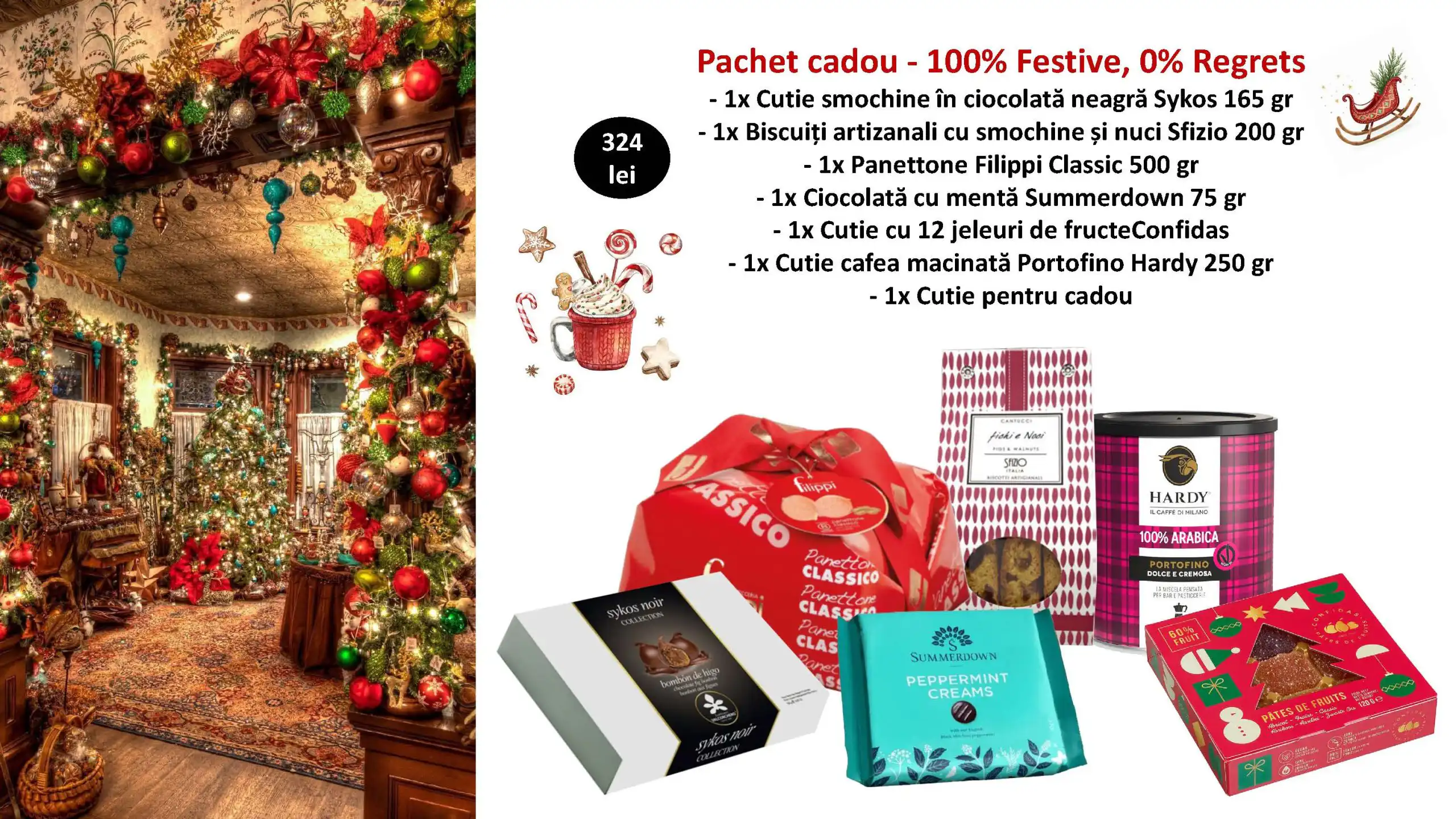 100% Festive, 0% Regrets este un coș care aduce exact ce promite: gusturi alese, ambalaj festiv și zero regrete.