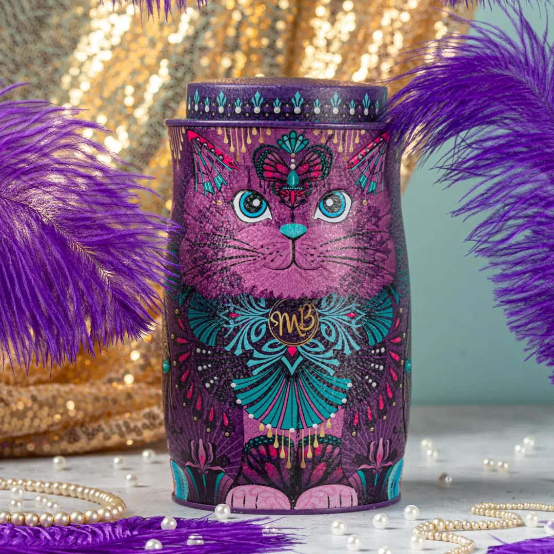 Violet Rebel iti oferă trufe fine cu ciocolată, într-o cutie metalică pe care sigur n-o vei arunca. Este prea frumoasă, prea de colectie. Gust intens, textură catifelată și o pisică mov cu atitudine, care pare că alege singură cui îi dă ultima trufă.