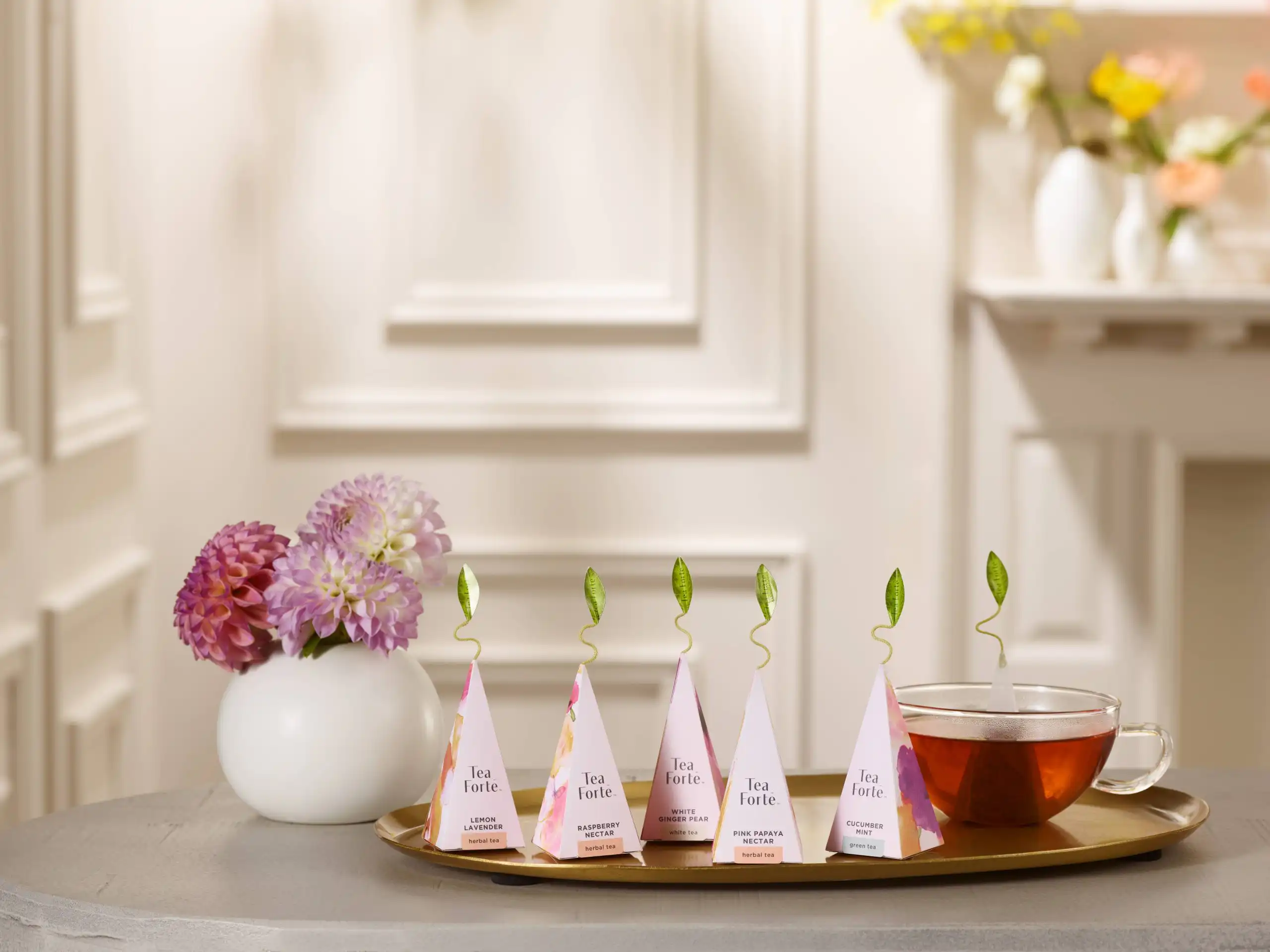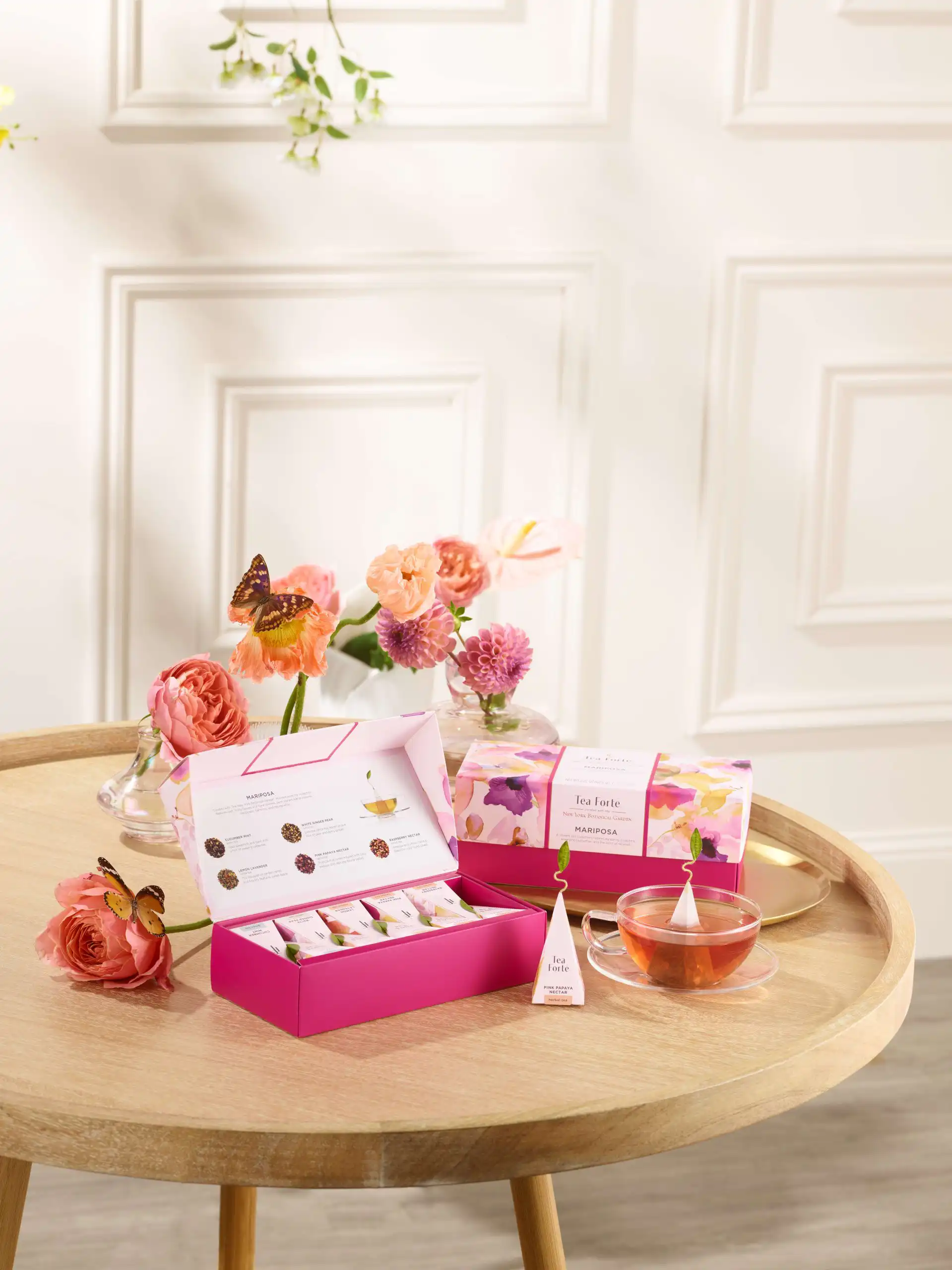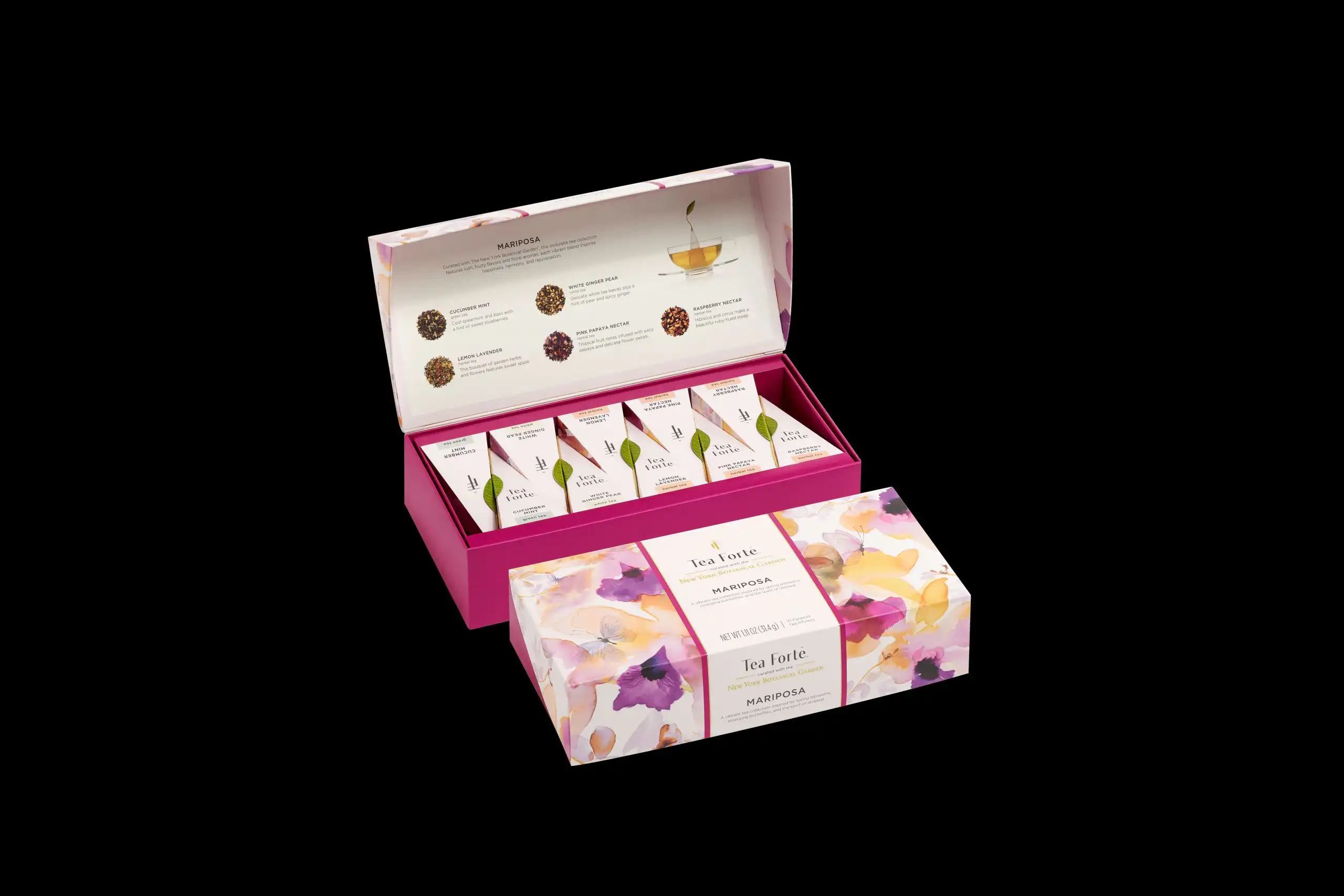 Această cutie elegantă face parte din colecția Mariposa, a șasea colaborare a Tea Forté cu New York Botanical Garden. Inspirată de frumusețea primăverii și a noilor începuturi, colecția aduce un omagiu naturii prin designul său delicat. Cutia este decorată cu ilustrații florale realizate de un artist al grădinii botanice, iar culorile pastelate – roz, galben, mov și portocaliu – evocă prospețimea și vitalitatea anotimpului. Ambalajul este elegant și rafinat, potrivit pentru cadouri speciale sau momente de răsfăț personal.