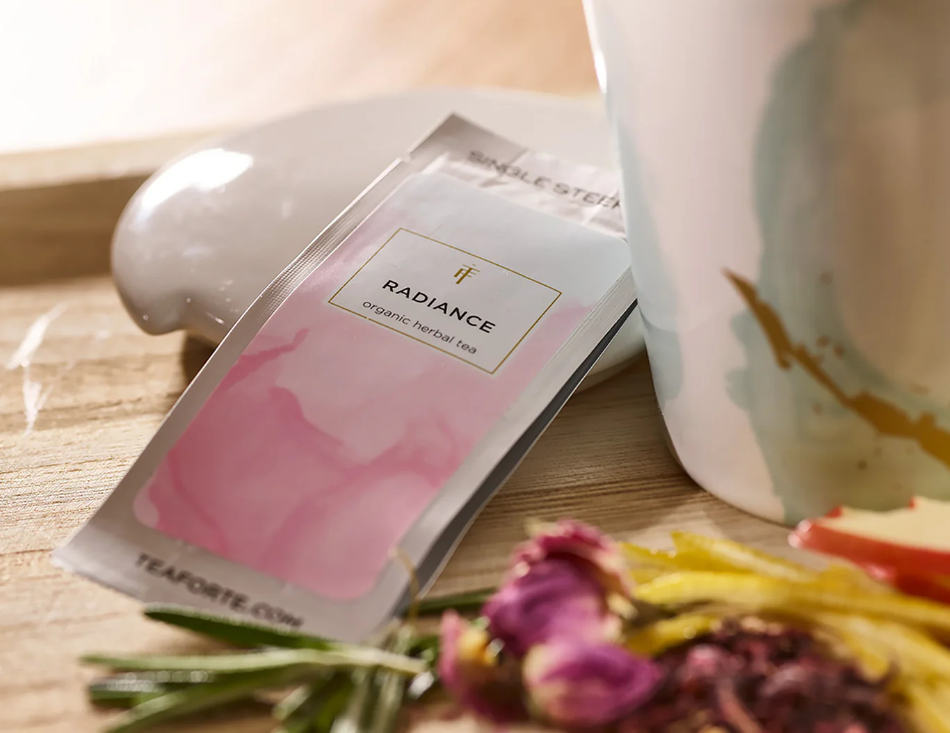 Fiecare cutie conține cincisprezece punguțe de ceai liber măsurate, câte 3 din fiecare amestec: Defense (ceai verde), Invigorate (ceai verde), Purify (ceai din plante), Radiance (ceai din plante) și Serenity (ceai din plante). Când ridici capacul, se dezvăluie un meniu de degustare detaliat. Toate ceaiurile din această colecție sunt organice USDA și certificate Kosher.