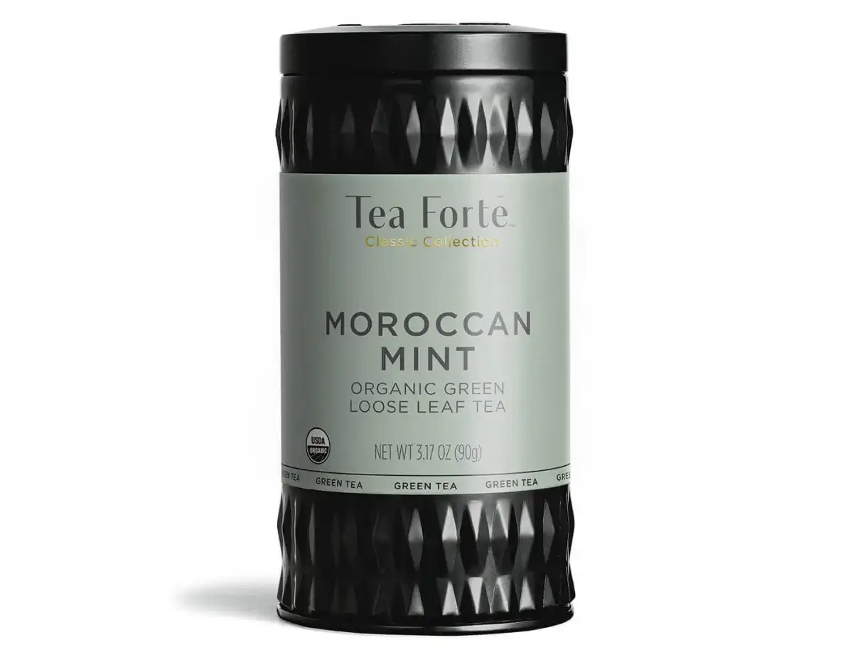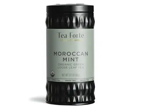 Ceaiul verde cu mentă marocană, premiat , de la Tea Forté, combină ceaiul verde chinezesc, rulat manual, cu frunze proaspete de mentă. Cunoscut și sub numele de atay bi nahna, ceaiul de mentă marocană este băutura națională a Marocului și este ceaiul tradițional al ospitalității marocane. Frunzele de ceai verde sunt rulate pentru a proteja uleiurile prețioase, iar pentru primii comercianți, aceste frunze semănau cu alicele, de unde și numele. Menta Nana este o mentă parfumată cultivată doar în Africa de Nord, cu un caracter distinct, asemănător mentei și mentolului. Acesta este un ceai preferat al ospitalității atât în Maroc, cât și în Orientul Mijlociu, unde este preparat în mod obișnuit. Se servește în mod tradițional, indulcit cu zahăr, în pahare transparente . Se crede că este un minunat ajutor digestiv, renumit pentru proprietățile sale anti-arsuri la stomac. Studiile arată că ceaiul verde ajută la detoxifierea organismului, reglează glicemia și promovează sănătatea dinților, a pielii și a oaselor.