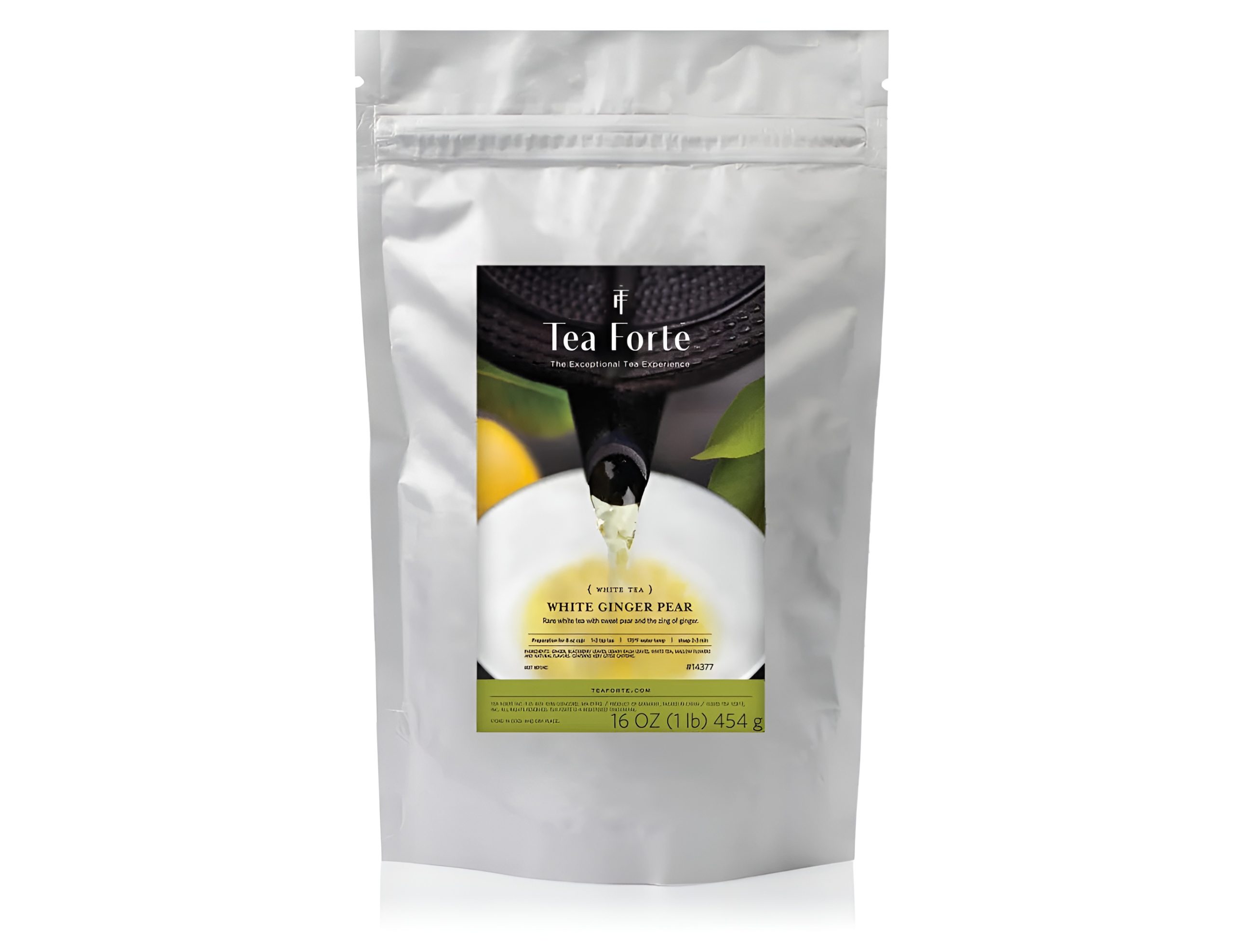 Ceaiul alb cu ghimbir și pară de la Tea Forté provine din cea mai faimoasă regiune de ceai din China. Ceaiul alb provine de la arbustul de ceai Da Bai, care este recoltat primăvara. Acest ceai alb fin este infuzat cu melisă, o plantă care face parte din familia mentei, contribuind la caracter citric, curat și proaspăt și se crede că are efecte calmante puternice și încurajează relaxarea. Ghimbirul aduce o notă picantă care este benefică pentru digestie, iar notele de pară și rădăcină de lemn-dulce le îmbină pe toate. Ușor cofeinizat, atât liniștește, cât și iluminează, oferind o ușoară senzație de bine dimineața, după-amiaza sau seara, indiferent de momentul zilei in care este consumat.O combinație originală de ceai alb și ghimbir, echilibrată de pere proaspete. O infuzie dulce, suculentă, cu un postgust surprinzător.