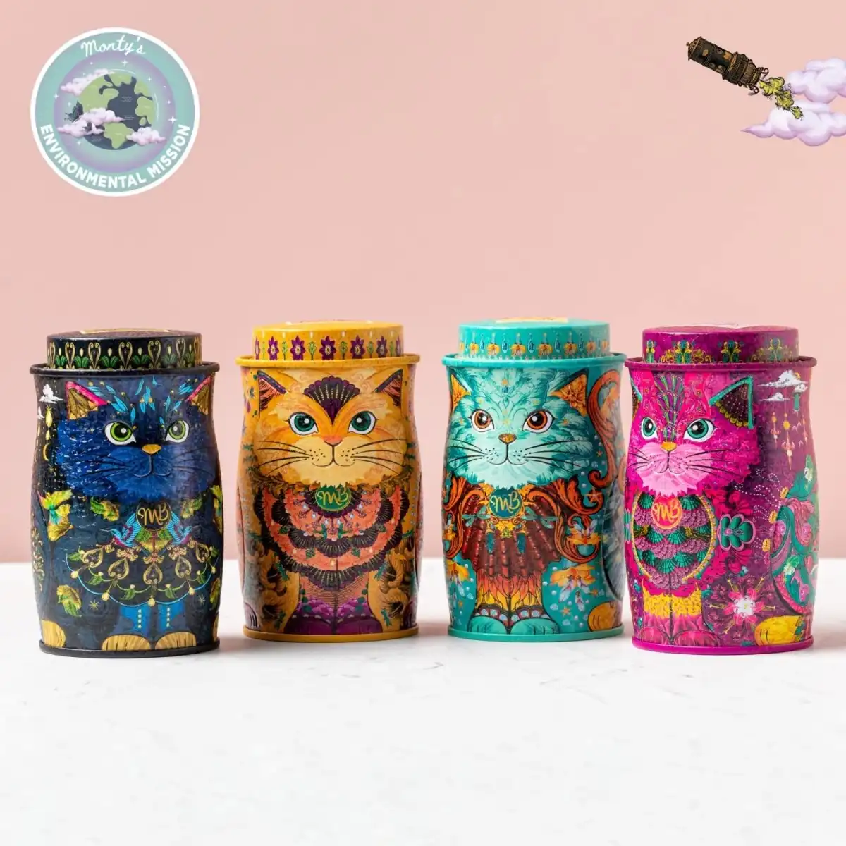Rasfatati-va cu combinatia remarcabila de arome delicioase de trufe frantuzesti de la MONTY BOJANGLES in 4 cutii unice pentru pisici. Fiecare cutie este conceputa in mod unic ca o pisica frumoasa si fantastica, cu propria ei personalitate si farmec! Set cu 4 cutii metalice din colectia Persian Cat: Pink, Blue, Vegan si Savanna.