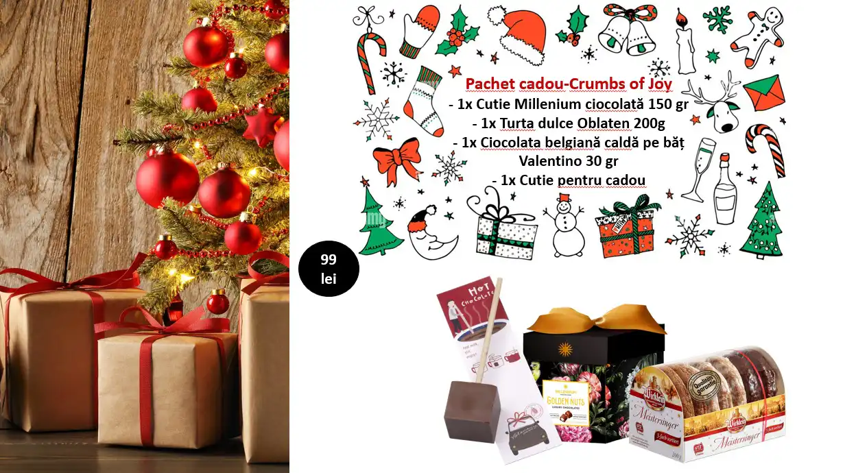 Crumbs of Joy este pachetul care transformă micile plăceri în amintiri de neuitat. O selecție atent aleasă de delicii de Crăciun – de savurat, de dăruit, de păstrat aproape. Perfect pentru cei care știu să se bucure de lucrurile simple, dar făcute cu gust și grijă.