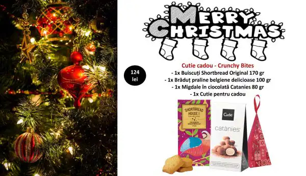 Crunchy Bites este un cadou delicios, creat pentru momente de bucurie în jurul bradului! Pachetul aduce la un loc gustări fine, crocante și irezistibile, perfecte pentru a fi savurate lângă o cană cu ceai, ciocolată caldă sau vin fiert.