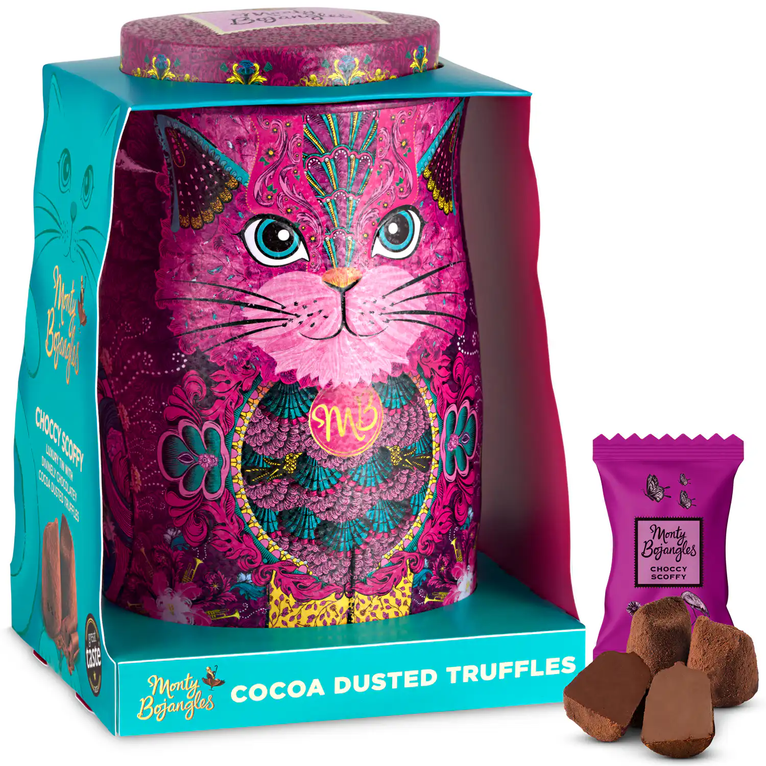 – Nume complet: Monty Bojangles Choccy Scoffy Truffles in Persian Pink Cat Tin 35 g