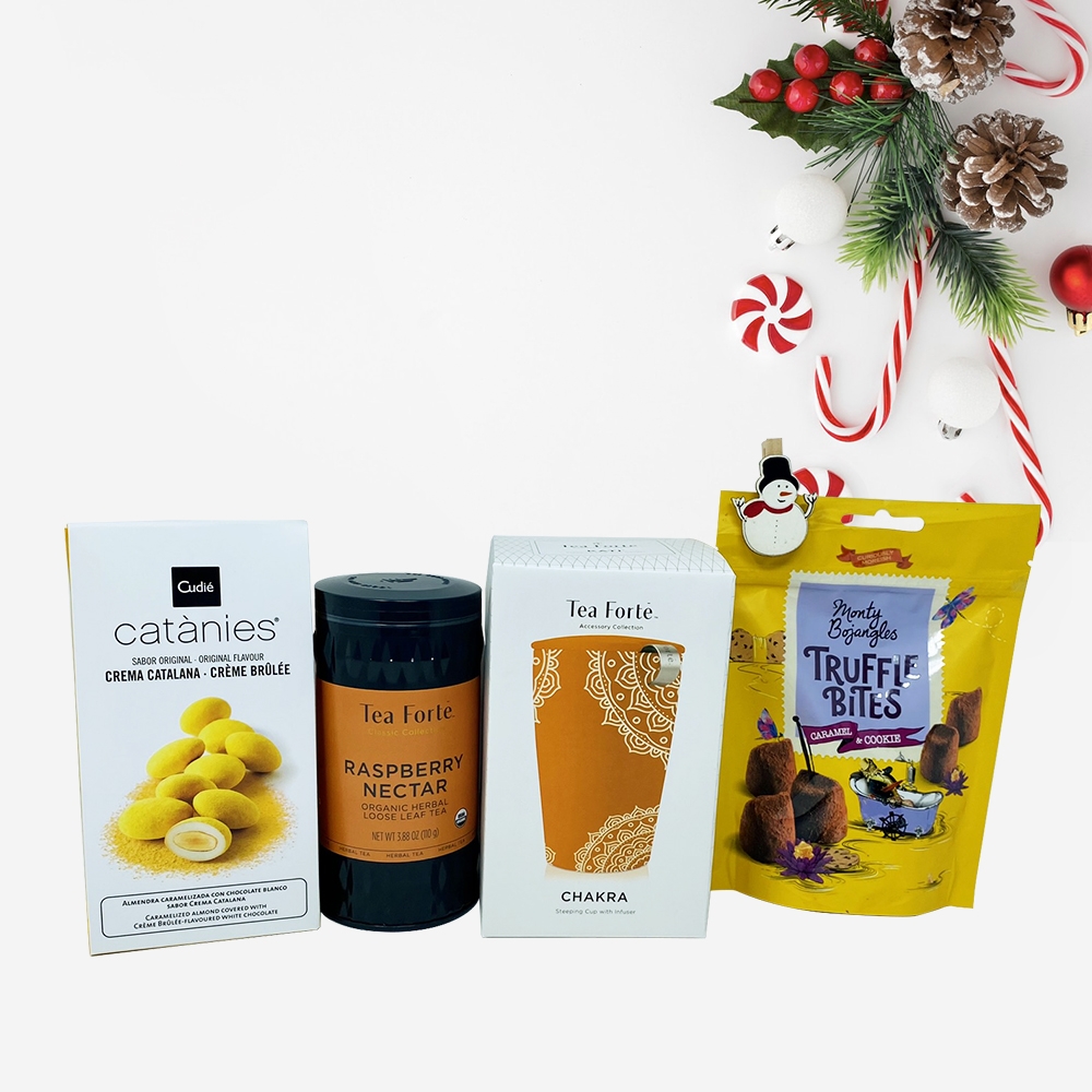 Pachet cadou cu ciocolata, migdale glazurate, cana si ceai Chakra