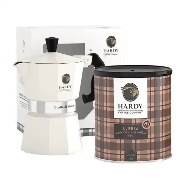 Pachetul contine un espresor manual pentru preparare a cel mult 3 cesti de cafea si o cutie de cafea macinata 250g. Cele doua produse sunt ambalate in cutie de cadou.