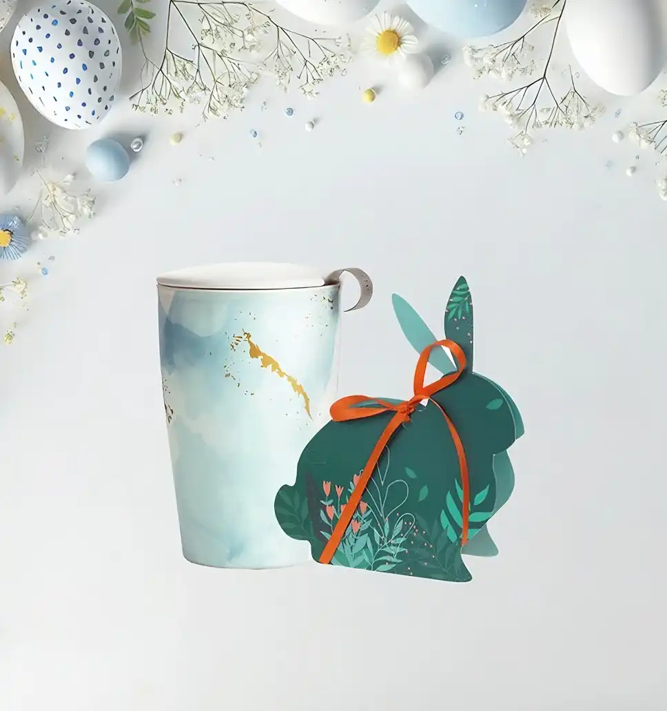 Coș cadou de Paște cu cană și praline belgiene – răsfăț pentru iubitorii de ceai și ciocolată fină