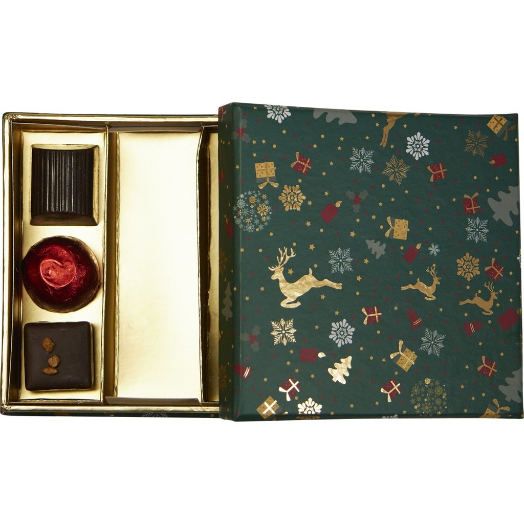 Cu un design festiv ce combină armonios nuanțe profunde de verde și accente aurii, această cutie de praline inspiră bun-gust și rafinament. În interior, pralinele atent așezate, în culori calde și nuanțe bogate de ciocolată, promit o experiență premium. Un cadou gata pregătit pentru a aduce zâmbet, surpriză și plăcere în orice moment de sărbătoare.