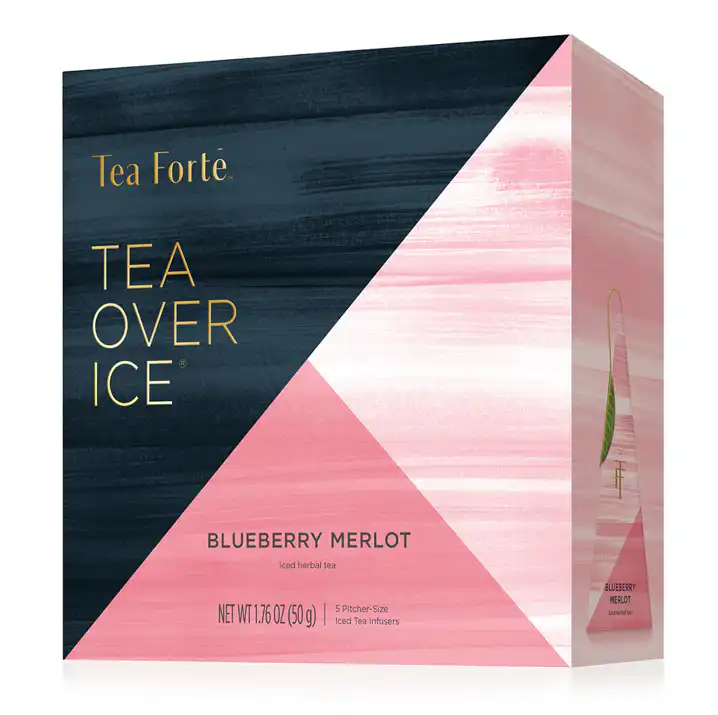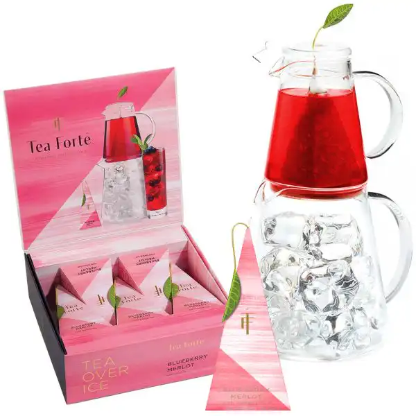 PACHET DE CADOU Setul nostru de Carafe Tea Over Ice® pentru pregatirea ceaiului rece este disponibil ca un pachet de 5 piramide Blueberry Merlot! Infuzați ceai rece autentic Tea Forte cu ajutorul setului de carafe Tea Over Ice®. Cele două carafe realizate manual, rezistente la căldură Steep & Chill™ ( Infuzeaza si raceste) infuzează ceai rece în câteva minute și se pot aseza una peste alta pentru o prezentare deosebita pe masă. Făcute din sticlă durabilă, rezistentă la căldură, aceste carafe sunt capabile să reziste unei game largi de extreme de temperatură. Piramidele cu ceai rece sunt aproximativ cu 33% mai mari decât piramidele pentru ceaiul cald și sunt amestecate special pentru a fi realiza un ceai proaspat și plin de aromă prin procesul de răcire rapidă. Fiecare piramida de ceai rece produce 720 ml de ceai rece răcoritor. Pentru a infuza, adăugați o piramida de ceai rece în carafa de sus, umpleți cu apă fierbinte și infuzați timp de 5 minute. După infuzare, răciți rapid turnând ceaiul fierbinte infuzat în carafa de jos, umplută cu cuburi cu gheață. Amestecați, serviți și bucurați-vă! Pachetul TEA OVER ICE contine: