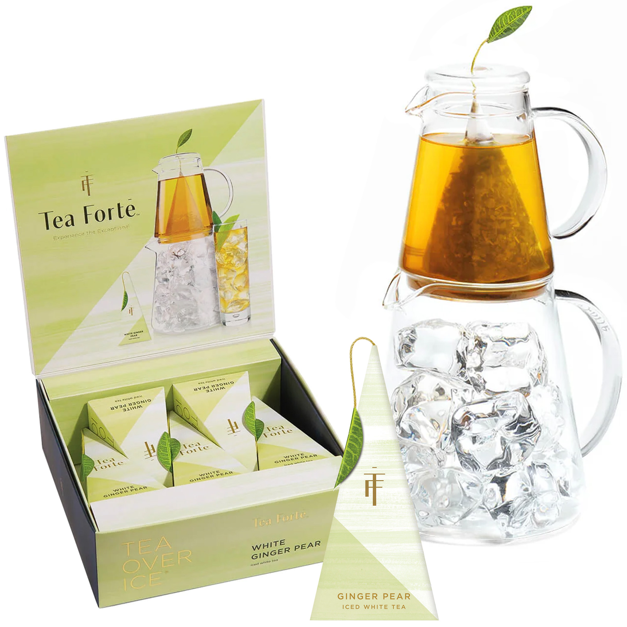 PACHET DE CADOU Setul nostru de Carafe Tea Over Ice® pentru pregatirea ceaiului rece este disponibil ca un pachet de 5 piramide ceai alb White Ginger Pear! Infuzați ceai rece autentic Tea Forte cu ajutorul setului de carafe Tea Over Ice®. Cele două carafe realizate manual, rezistente la căldură Steep & Chill™ ( Infuzeaza si raceste) infuzează ceai rece în câteva minute și se pot aseza una peste alta pentru o prezentare deosebita pe masă. Făcute din sticlă durabilă, rezistentă la căldură, aceste carafe sunt capabile să reziste unei game largi de extreme de temperatură. Piramidele cu ceai rece sunt aproximativ cu 33% mai mari decât piramidele pentru ceaiul cald și sunt amestecate special pentru a fi realiza un ceai proaspat și plin de aromă prin procesul de răcire rapidă. Fiecare piramida de ceai rece produce 720 ml de ceai rece răcoritor. Pentru a infuza, adăugați o piramida de ceai rece în carafa de sus, umpleți cu apă fierbinte și infuzați timp de 5 minute. După infuzare, răciți rapid turnând ceaiul fierbinte infuzat în carafa de jos, umplută cu cuburi cu gheață. Amestecați, serviți și bucurați-vă! Pachetul TEA OVER ICE contine: