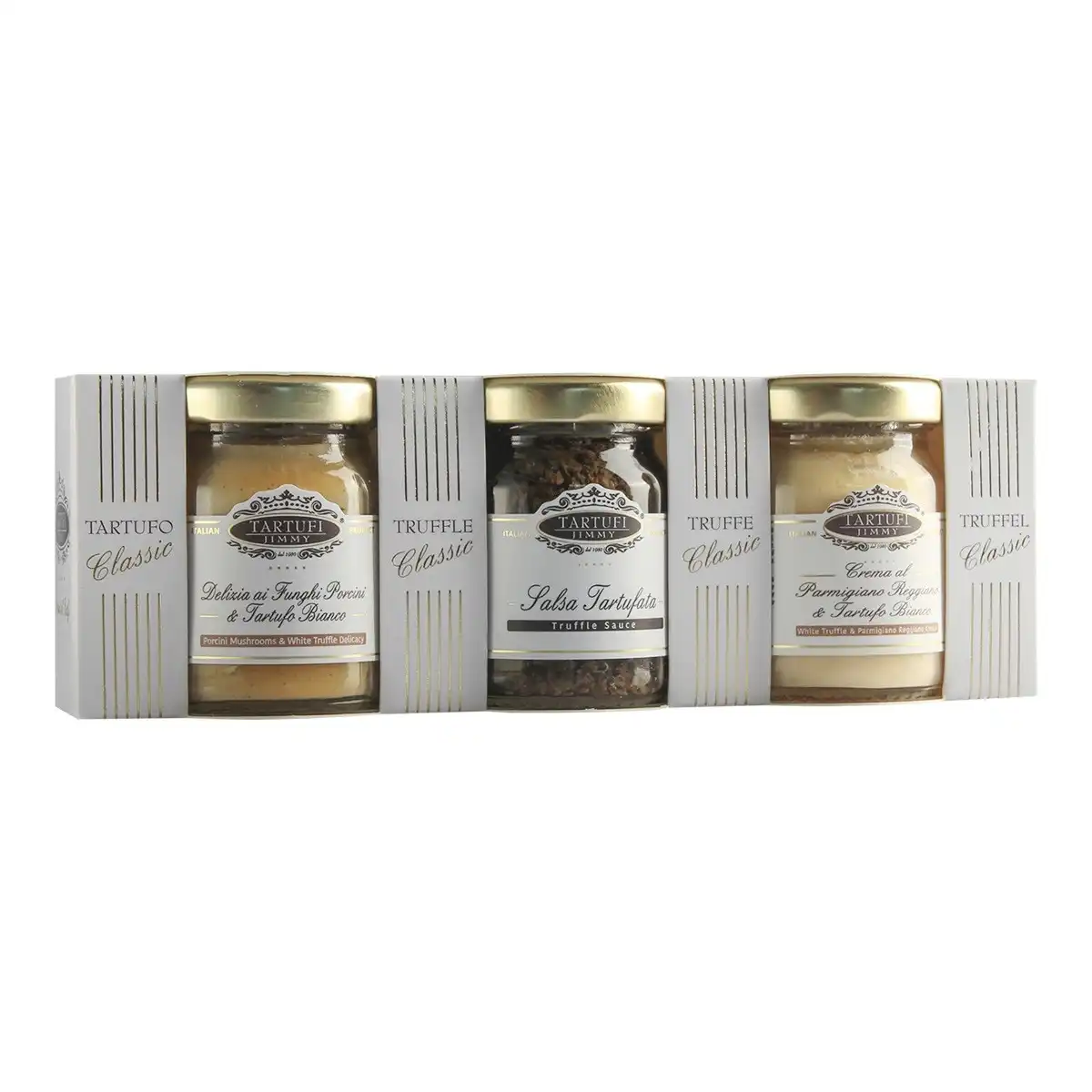 Trio Clasic Tartufi Jimmy este un pachet premium ce reunește trei din cele mai savuroase specialități pe bază de trufe, într-o prezentare ideală pentru gustări gourmet sau cadouri rafinate